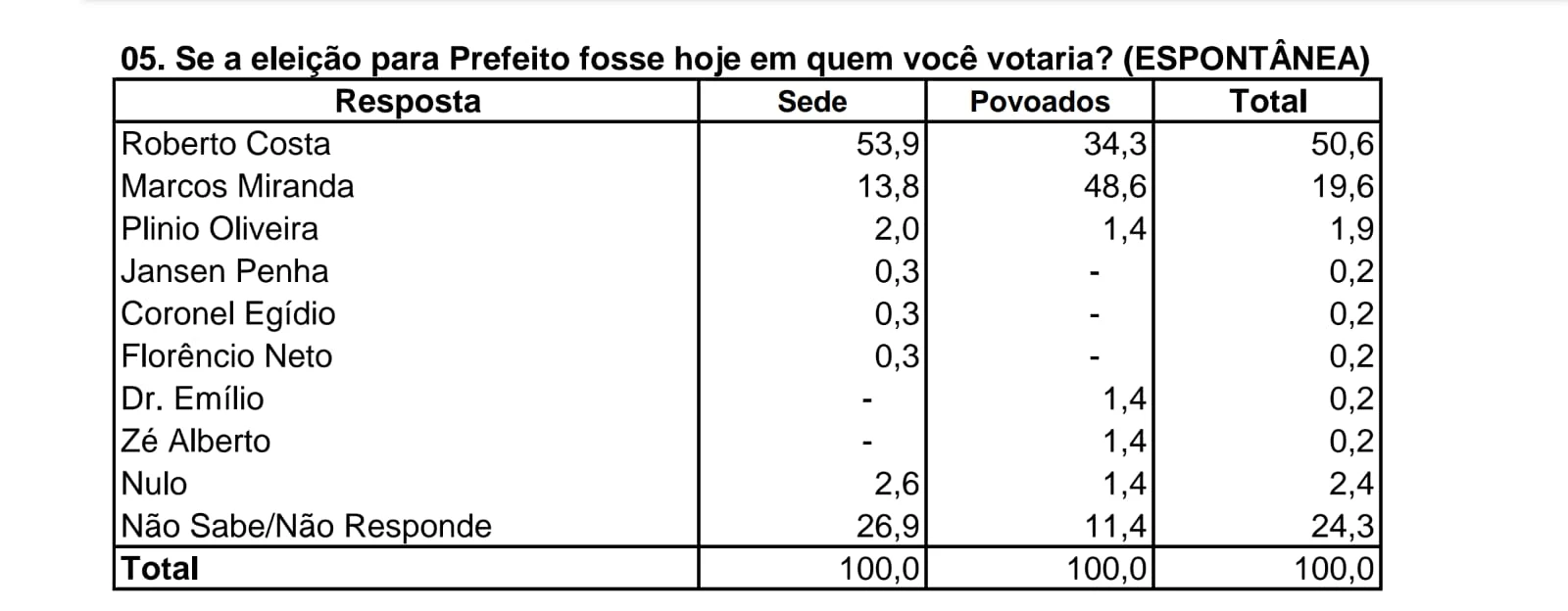 Quando apresentados os nomes dos candidatos, no primeiro cenário estimulado, Roberto Costa tem 63,2%. Depois vem Marcos Miranda com 23,4%, Plínio Oliveira com 3,3% e Jansen Penha, 0,5%.