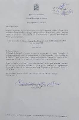 Em sua justificativa Reginaldo do Posto mostrou que as duas são colégios mais importantes dentro da estrutura da secretaria municipal de educação de Bacabal. Que, para a comunidade do povoado, elas representa a redenção dos seus filhos, uma vez que é lá que eles se preparam educacionalmente para vencer a vida.